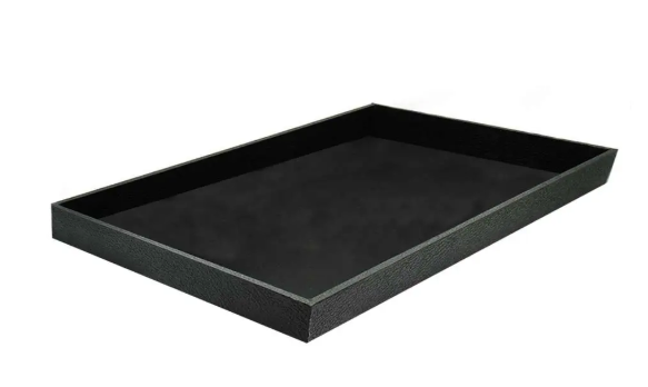 Black plastic with black velvet liner--trays interlock on the bottom and are stackable
